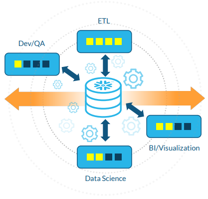 예를 들면 데이터 적재(Load)만 담당하게 되는 Virtual Warehouse, 데이터 분석 및 시각화만(BI/Visualization) 담당하게 되는 Virtual Warehouse 등으로 워크로드를 완벽하게 분리해서 특정 작업을 할당하면 리소스 경쟁도 없어지게 된다. 결과적으로 Virtual Warehouse는 다른 Virtual Warehouse의 성능에 영향을 미치지 않게 된다.