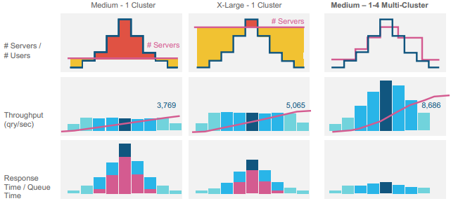 클러스터의 개수가 늘어남에 따라 실행환경을 과도/과소하게 프로비저닝하지 않고 요청에 맞게 자동으로 조정하고 처리량도 최대로 제공하는 것을 볼 수 있다. 또한 작업이 과하게 몰리는 피크 타임에도 일관된 성능을 제공할 수 있게 된다.