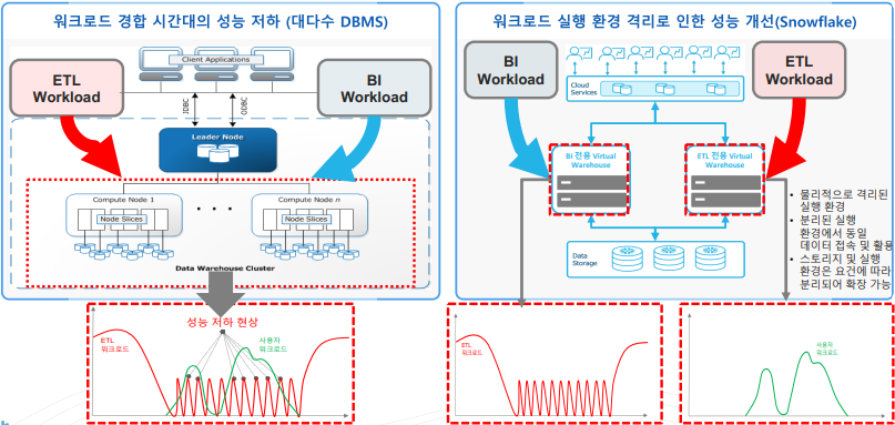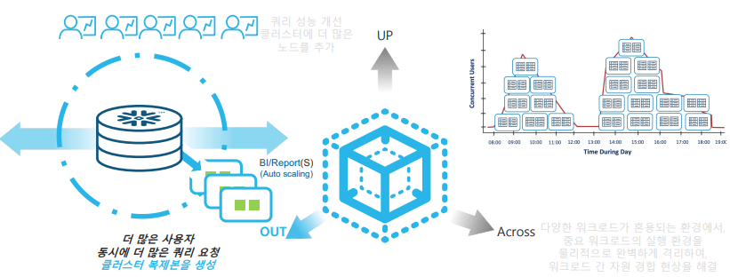 Scale Across는 다양한 워크로드가 혼용되는 환경에서 중요 워크로드의 실행 환경을 물리적으로 완벽하게 격리하여 워크로드 간에 자원 경합 현상을 해결한다. 위의 그림을 보면 기존 대다수 DBMS는 워크로드가 몰리는 경합 시간대에서 성능 저하가 발생하는 것을 볼 수 있는데 Snowflake에서는 워크로드의 물리적 실행 환경을 격리시키고 분리된 실행 환경에서 동일한 작업을 처리하여 성능을 개선한다.