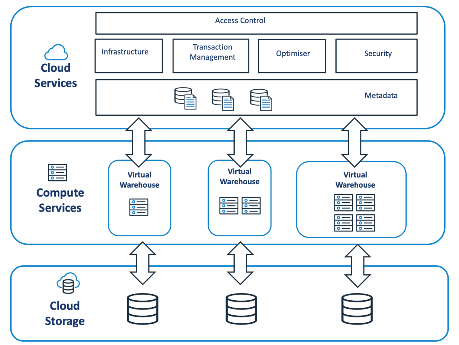 아래 다이어그램은 Snowflake 아키텍처와 Virtual Warehouse가 Snowflake에 컴퓨팅 서비스를 제공하고 클라우드 서비스 계층에 의해 조정되는 방법을 보여준다.
