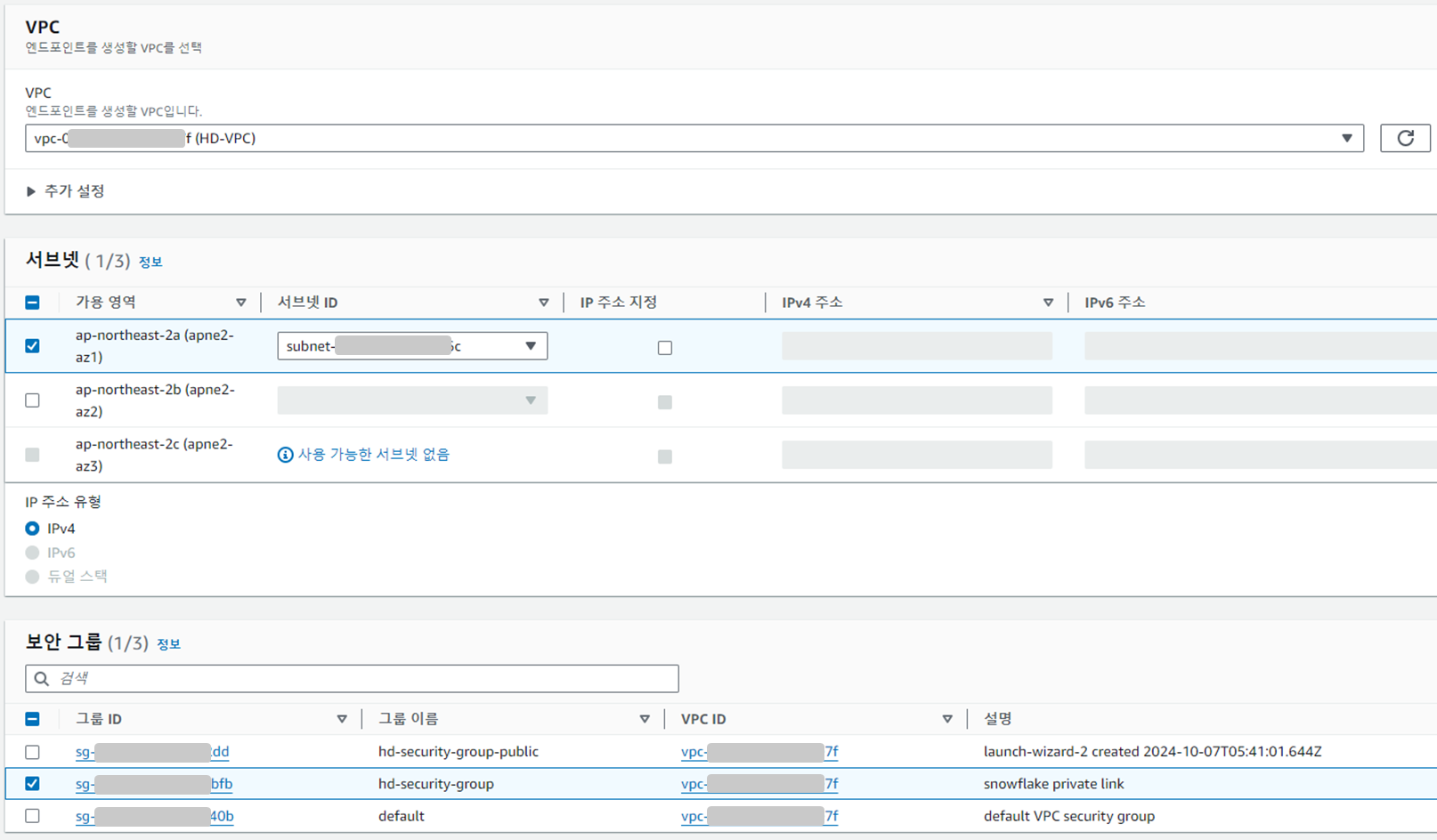 다음으로는 Snowflake와 Secure한 연결을 해야 하는 VPC와 Private Subnet을 선택하고 80, 443 포트를 허용하도록 설정한 보안 그룹을 선택한다.