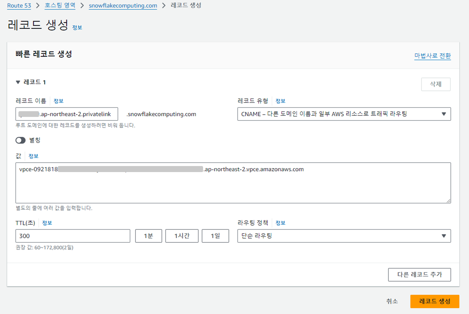 호스팅 영역이 생성되면 VPC 엔드포인트의 DNS 이름을 사용하여 CNAME 레코드를 추가한다.