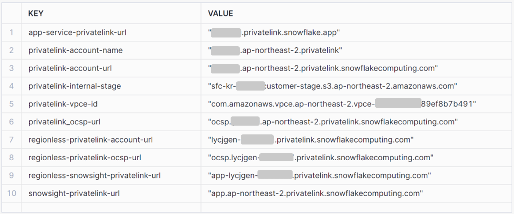 SELECT KEY, VALUE FROM TABLE(FLATTEN(INPUT=>PARSE_JSON(SYSTEM$GET_PRIVATELINK_CONFIG())));