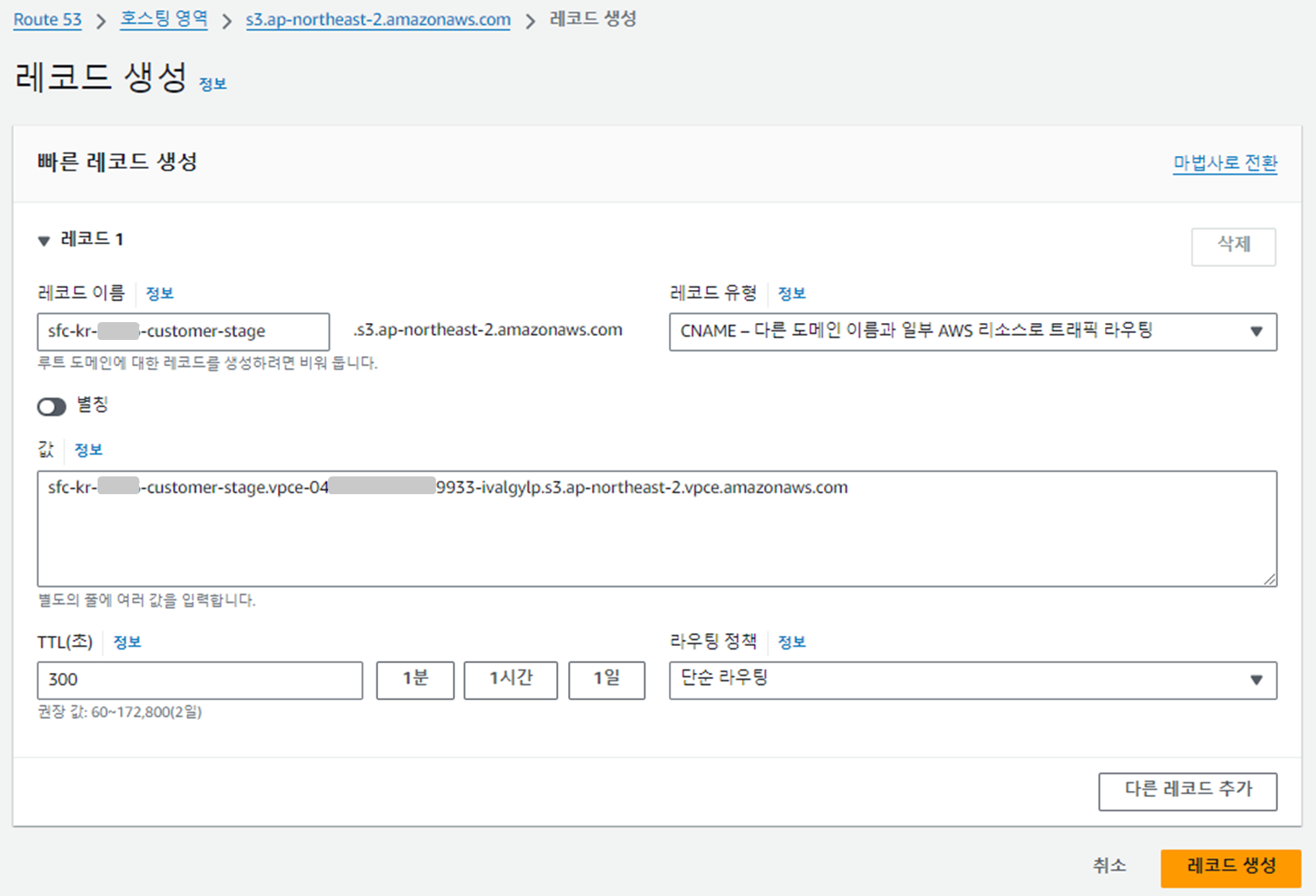 다음으로 레코드를 추가해보자. 레코드 이름은 privatelink-internal-stage 값을 참고해서 생성한다.