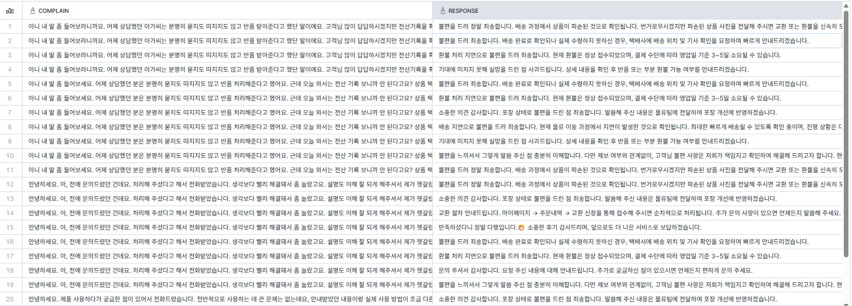 고객의 컴플레인 내용을 담은 테이블을 생성해놓고 그에 대한 응답 메뉴얼을 가진 테이블을 생성한다. 이후, 특정 컴플레인에 대한 적절한 응답을 할 수 있는지 확인해본다.