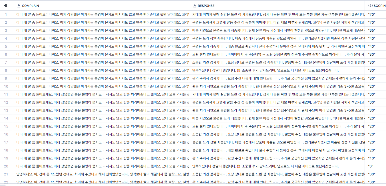 다른 답변은 출력하지마.', COMPLAIN, RESPONSE)) AS SCORING