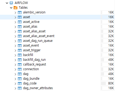 기존 Airflow 2 버전 대에서는 airflow db init 커맨드로 Database를 초기화해주었지만, 3 버전으로 올라와서는 위의 커맨드로 변경되었다. MySQL에 메타 테이블이 생성되면 정상이다.